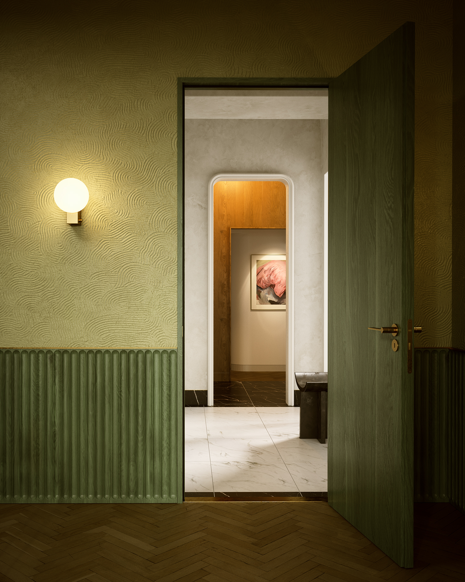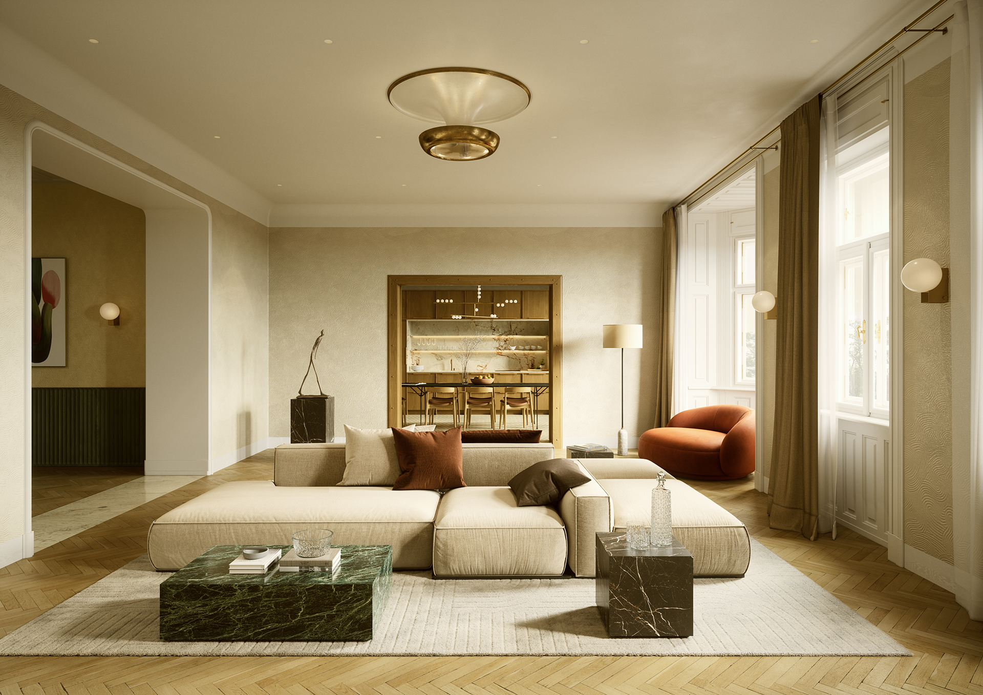 Na projektu bytu na Bělského třídě jsme navrhli interiér a připravili realistické vizualizace, které pomohly klientovi představit si finální podobu prostoru ještě před realizací. Interiér se nese v duchu nadčasové elegance a klidné přírodní estetiky. Pracovali jsme s teplými tóny dřeva, kamenem a jemnou strukturou stěn, které prostoru dodávají hloubku a příjemnou atmosféru. Nábytek na míru, jako kuchyňská stěna s podsvícením nebo ložnice s vestavěnými prvky, spojuje estetiku s praktičností.